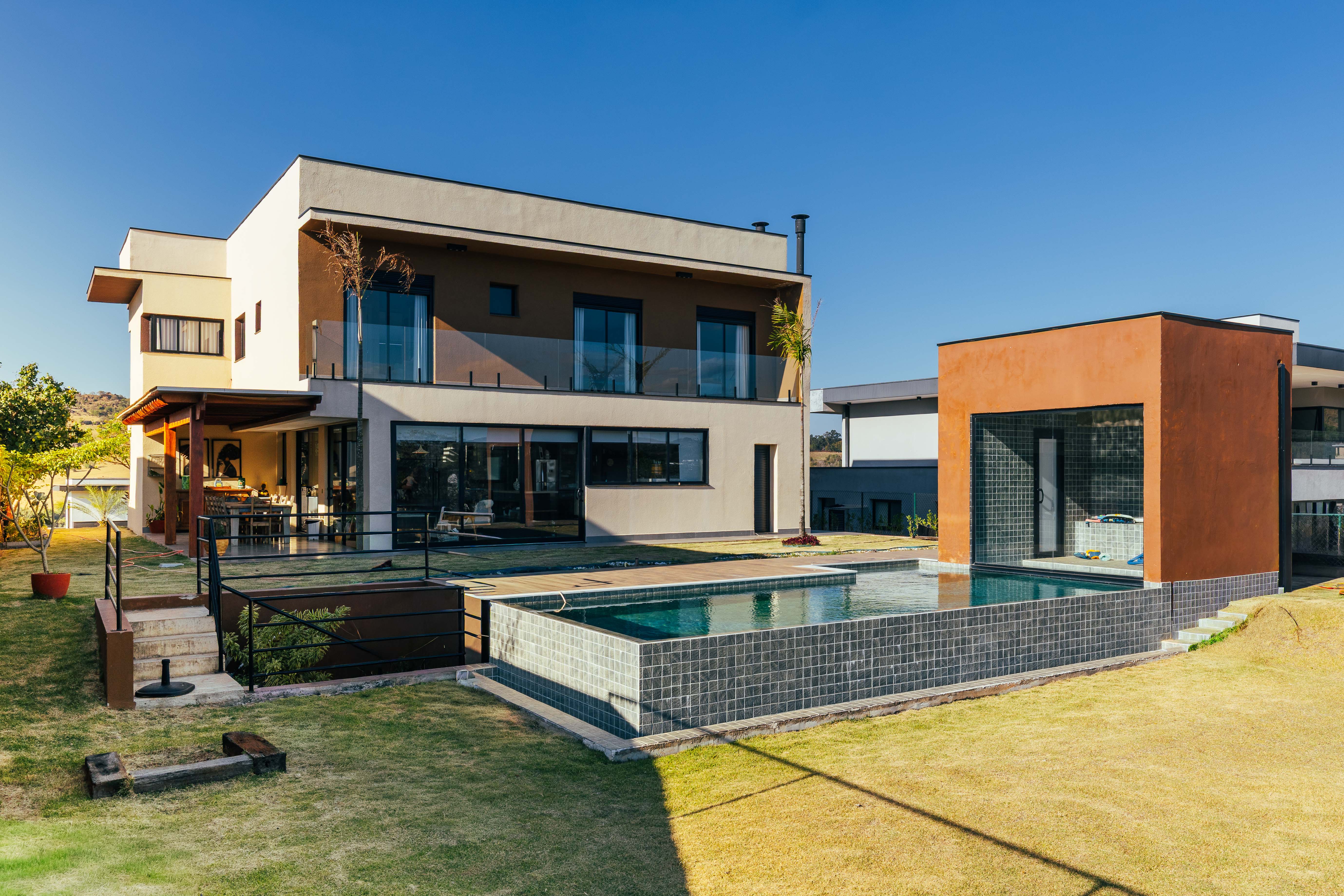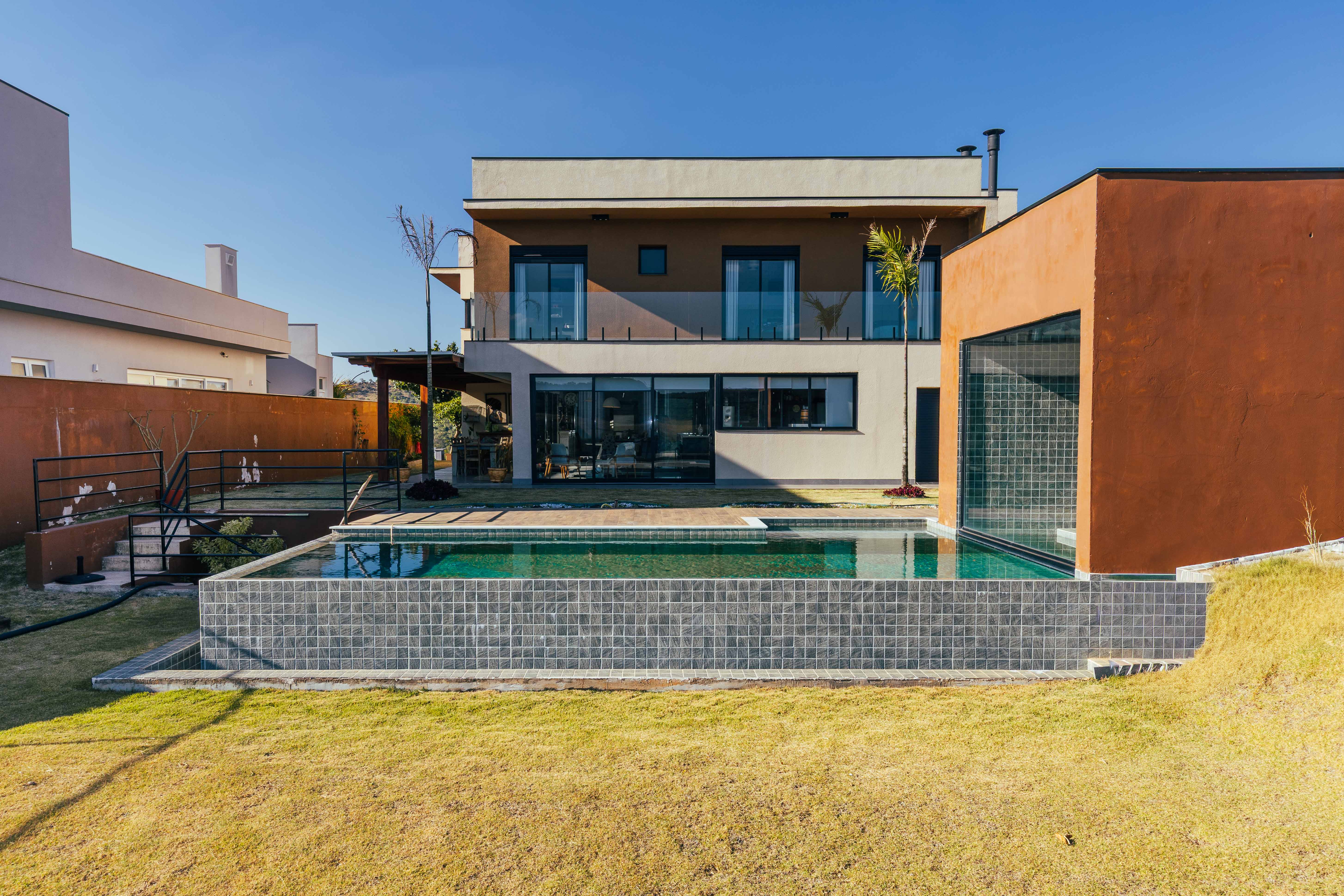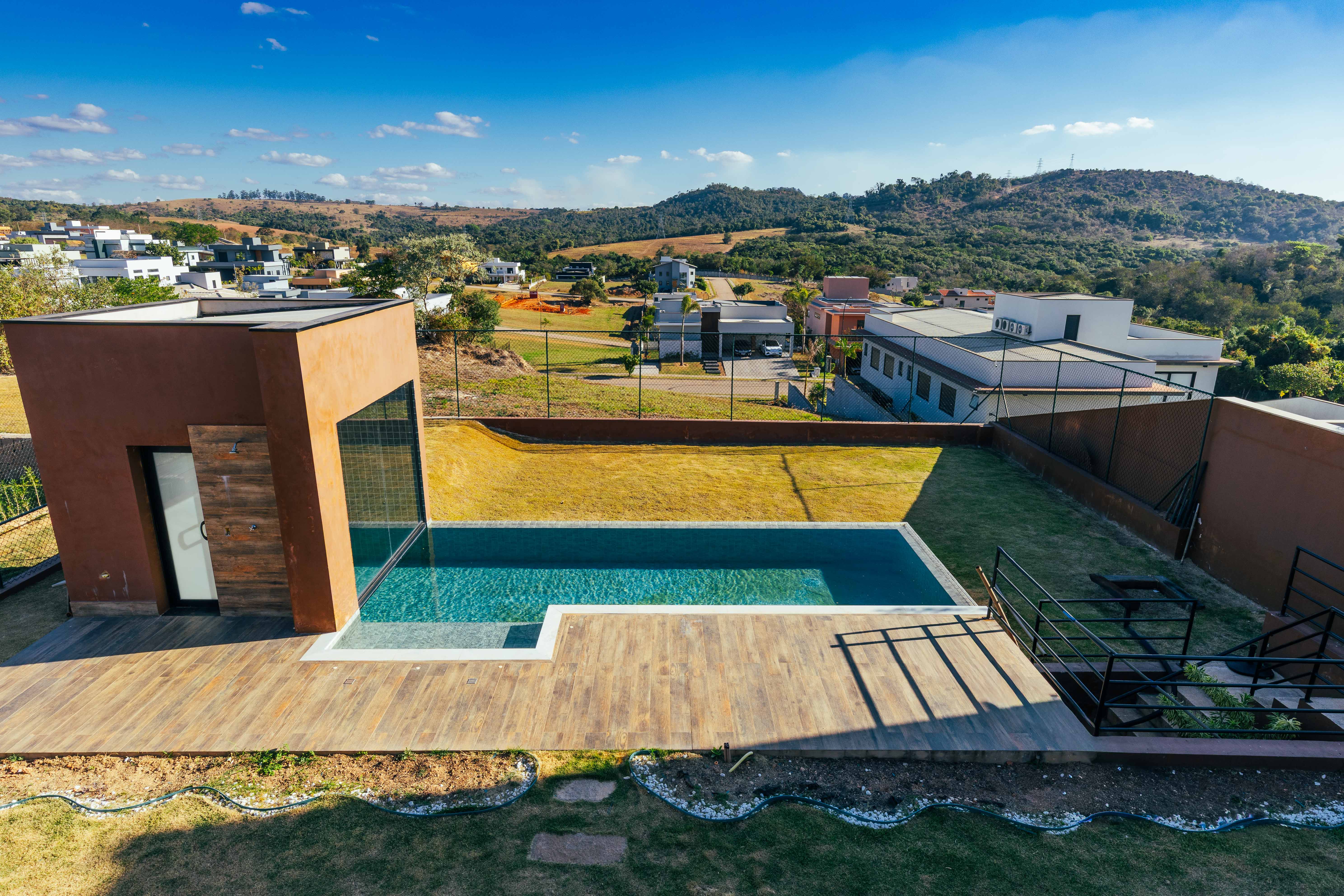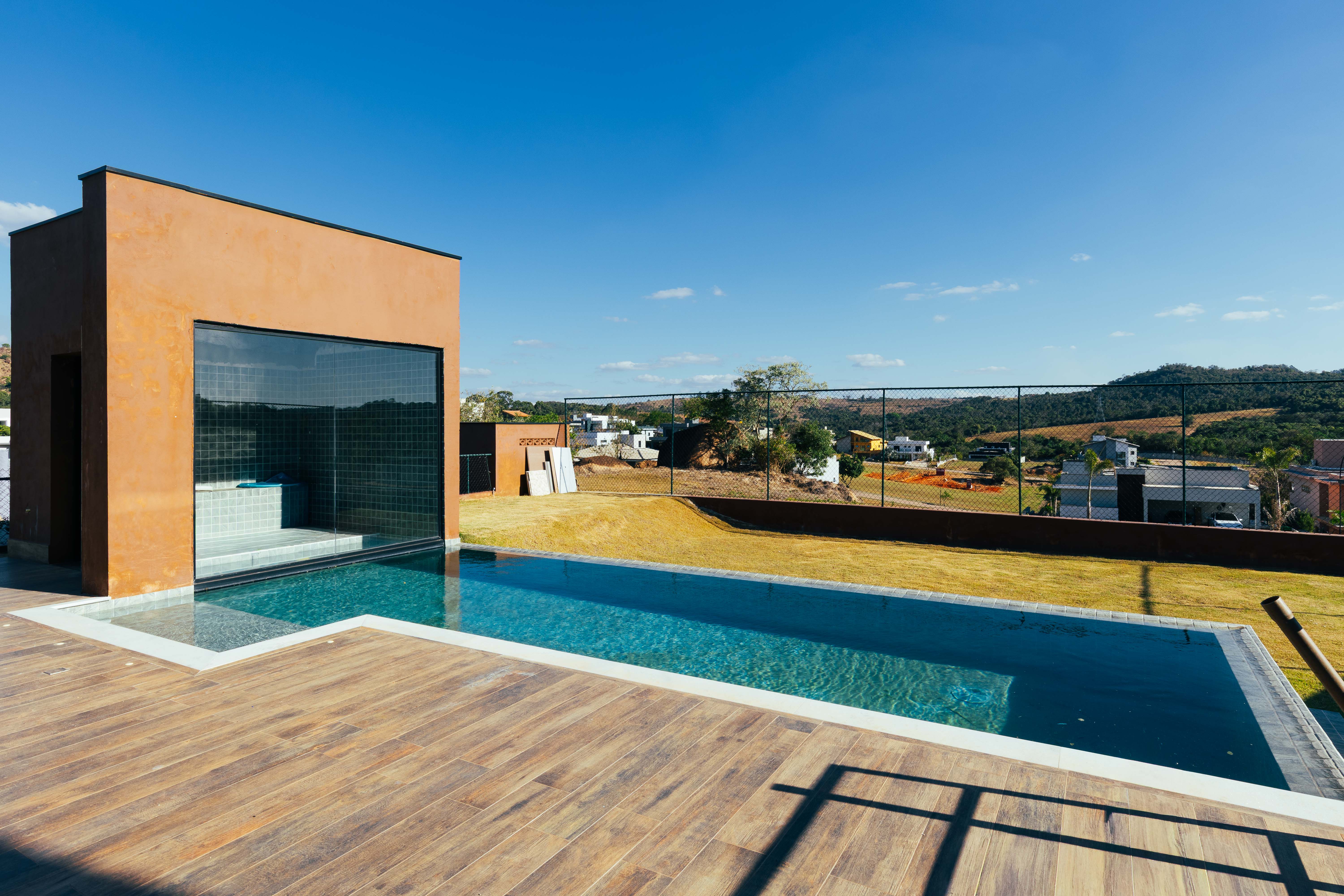 Piscina com borda infinita e sauna integrada, proporcionando momentos de relaxamento com total privacidade